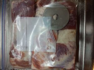 ベーコン用豚バラ肉の解凍実験は2時間で解凍し差が出ませんでした。ベーコン用に岩塩を擦り込み冷蔵庫で4日間熟成をスタートしました。ドーナツチタンも入れて熟成開始です。今朝上下を返しましたが、いつもより熟成が進んでいる気がしました。塩の効果で赤身の肉がピンク色に変化します。