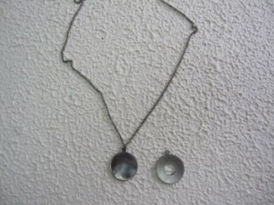 チタン製のペンダントを試作しました。円形とドーナツタイプの二種類です。チタンの留め金具を取り付けて完成です。音用の加工と、還元用の加工を考えています。金メッキも可能で今までの縮小版です。眼鏡産業でのチタン加工技術と組み合わせればいろんなことが出来ますが、シンプルに円形にこだわっています。