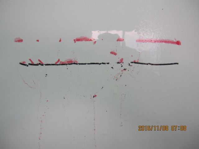 ホワイトボードに間違って油性マジックで書き込んだことがあります。慌てて拭いても取れません。アルコールで拭き取ることになります。この実験はホワイトボード表面にコートをして油性マジックで書き込んだものです。書き込んだ後に水を吹きかけると油性マジックが取れる実験です。