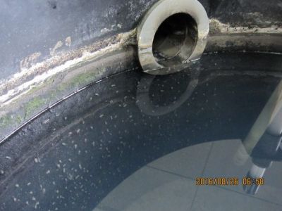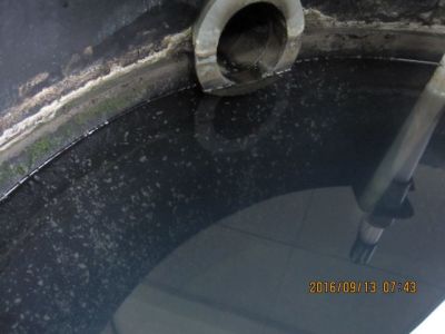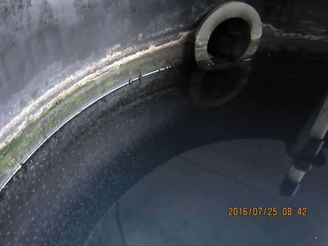 8月もあと少しですが昨日は猛暑日になりました。交流高電界発生装置を2012年6月に導入して4年が過ぎましたが現在の最終放流槽です。ここ数ヶ月藻の発生が無く変化がありません。一つ発見は蚊が発生したことです。水は不思議です。